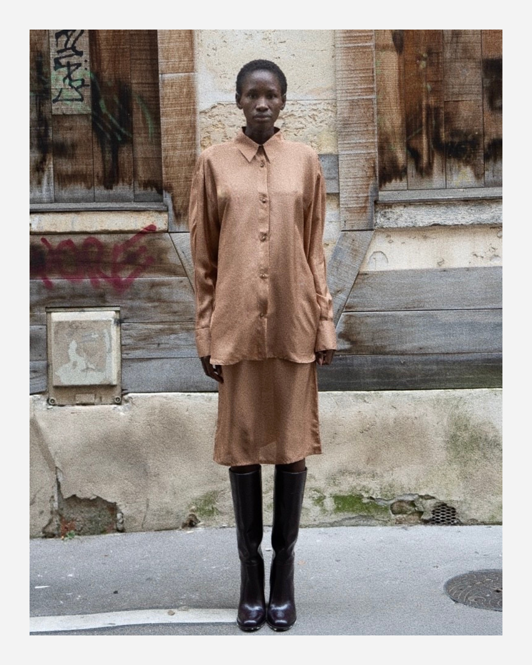 THE KATE SKIRT FEATURES A CLEAN, STRAIGHT SILHOUETTE DESIGNED TO FALL JUST BELOW THE KNEE, HIGHLIGHTING THE SOFT SHINE OF HABOTAI SILK.
