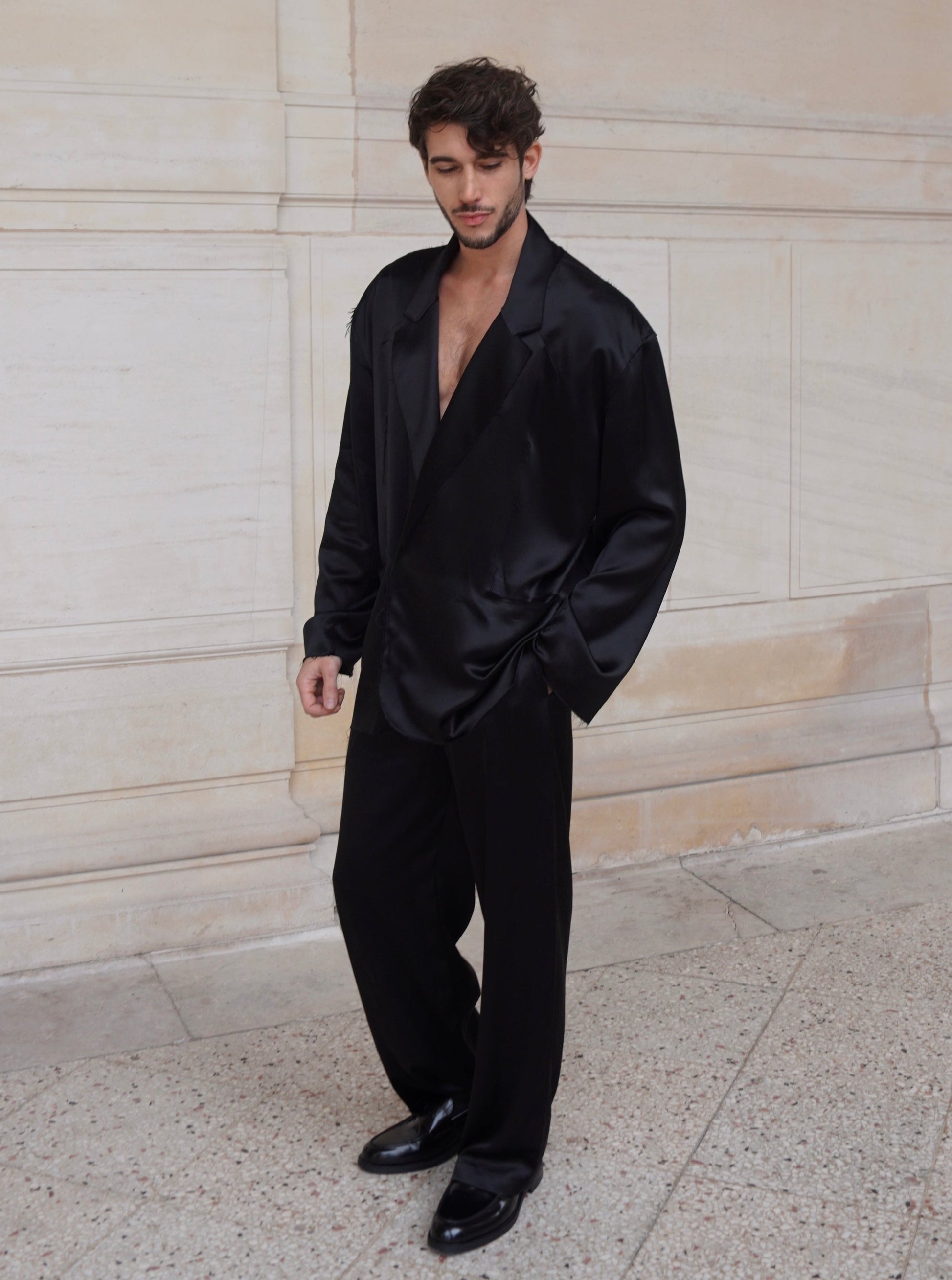 THE TALBOT JACKET MEANS SOPHISTICATION WITH AN EDGE. MADE FROM LUXURIOUS FULL-BODIED MULBERRY SILK SATIN AND ACCENTUATED BY ITS SHARP CUT- OUT EDGES. A TRUE STATEMENT.